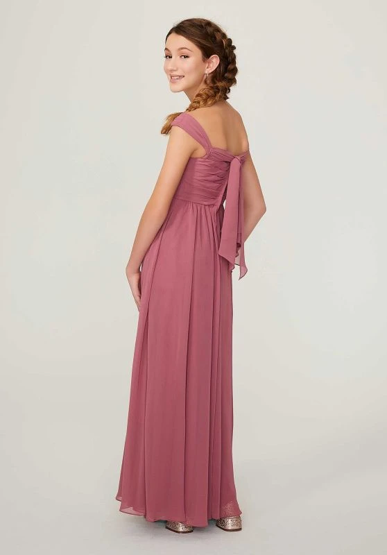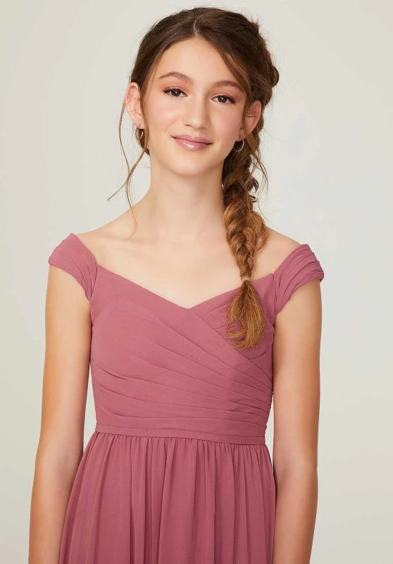 Mori Lee 13213 A-line junior bridesmaid dress is styled in luxe chiffon, featuring a draped bodice with an off-the-shoulder neckline and a tie-back accent. The seamed waist gives way to the fully gathered skirt.