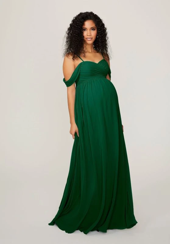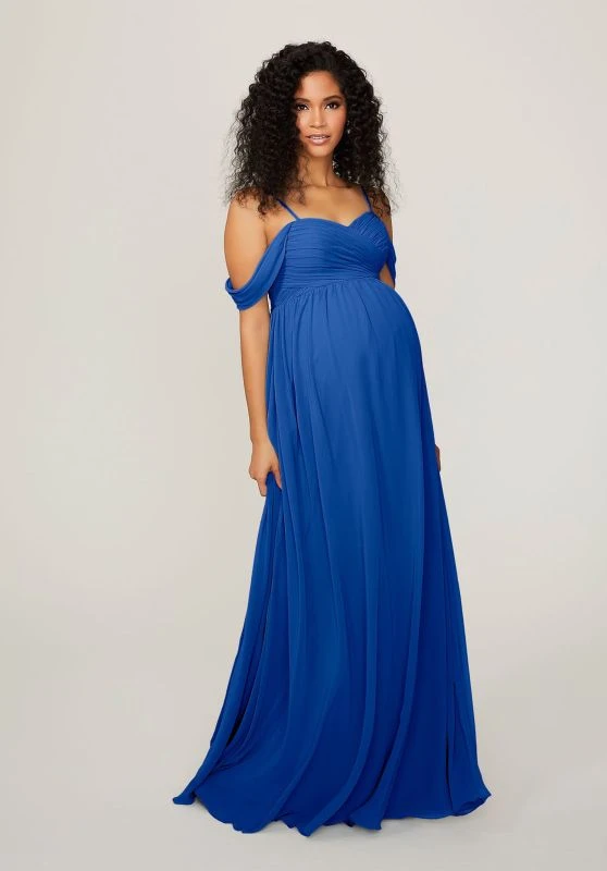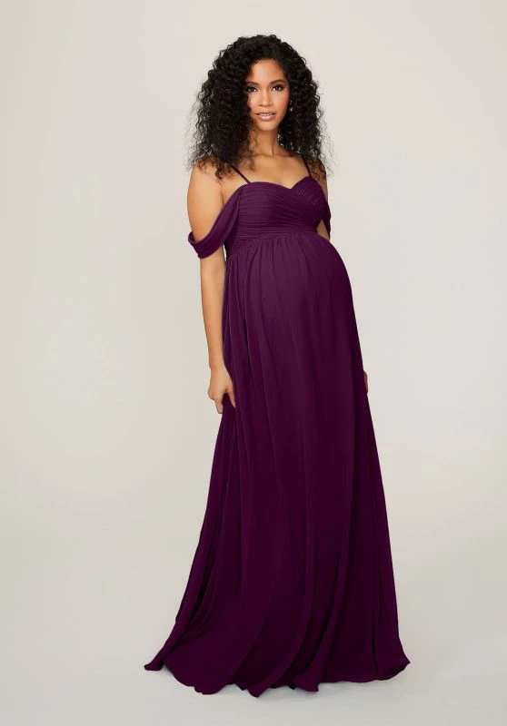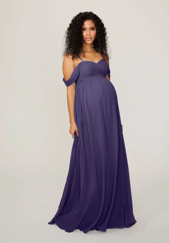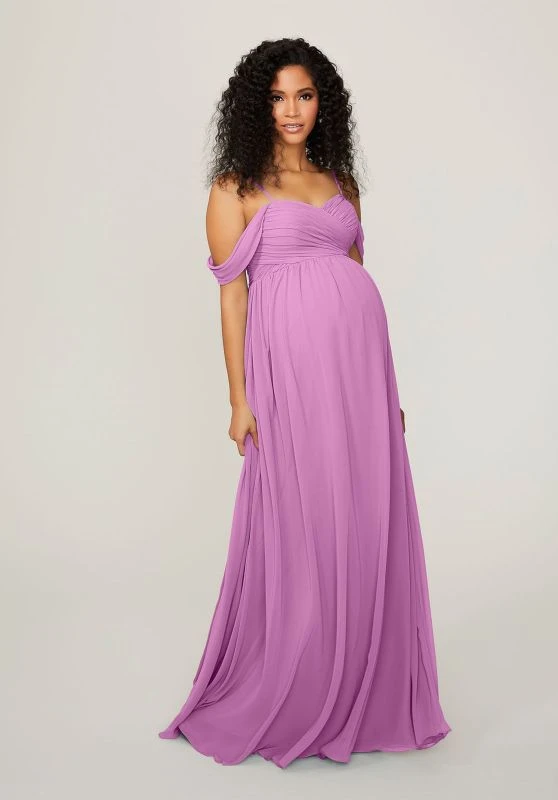 Mori Lee 14103 luxe chiffon maternity bridesmaid dress features a ruched surplice bodice with a sweetheart neckline, spaghetti straps and draped sleeves. This empire waist formal dress finishes in a fully gathered skirt with a sweep train.