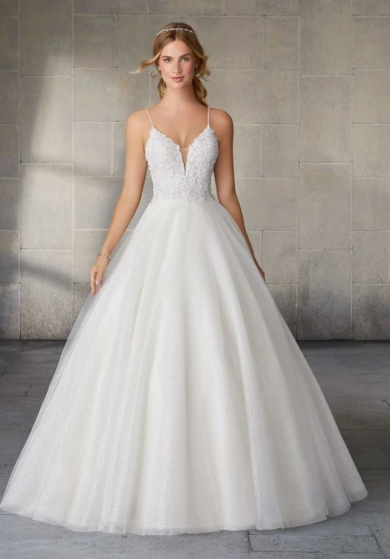 Mori Lee Bridal 2145W Starlet A-line plus size wedding ballgown features an intricately beaded bodice over a glitter tulle skirt and cathedral train. Beaded spaghetti straps trail off the mesh insert plunging neckline and crisscross atop the buttoned back.