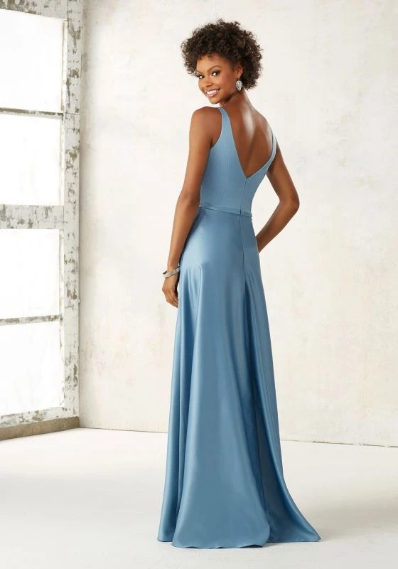 Mori Lee 21525 sleeveless bridesmaid dress features an A-line silhouette in luxe satin, detailed with a V-neckline, V-back, and side seam pockets. A thin waistband accents this flattering gown, finished off with a slight brush train.