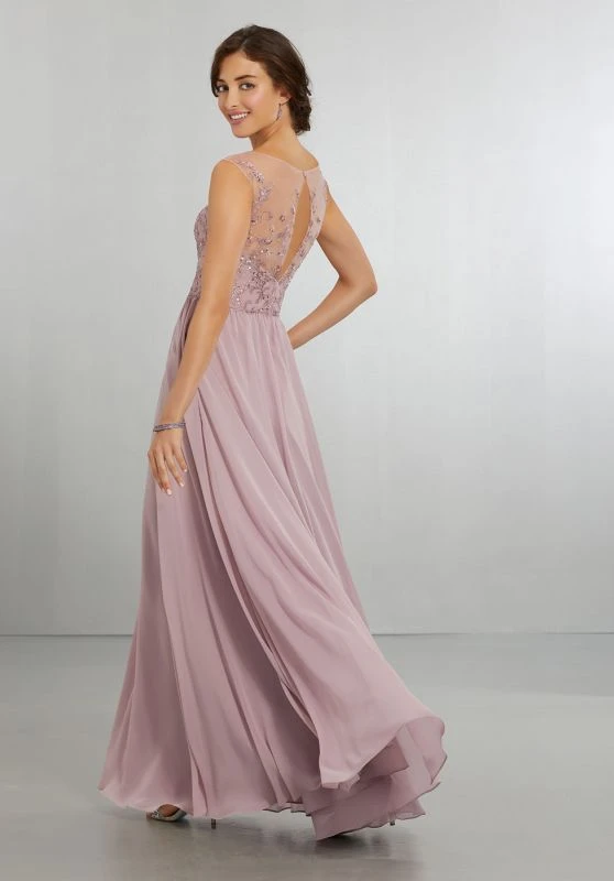 This Mori Lee 21558 bridesmaid dress features a metallic embroidered bodice, with mini cap sleeves extending from the V-neckline and the keyhole illusion back. A fully gathered skirt completes this flattering A-line gown. Available in all chiffon colors.