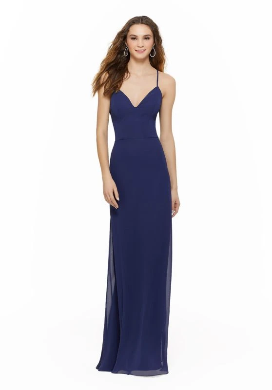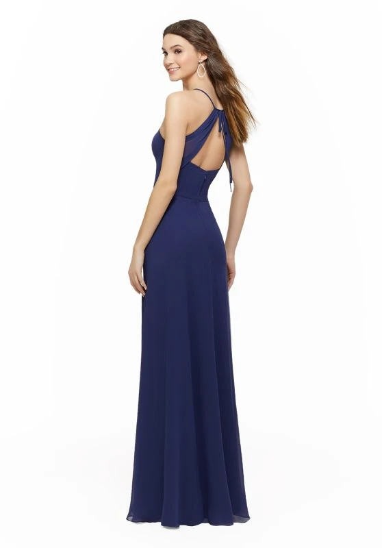 This Mori Lee 21634 chiffon A-line bridesmaid dress features a V-neckline, edged with spaghetti straps that tie over the triangular cutout back.