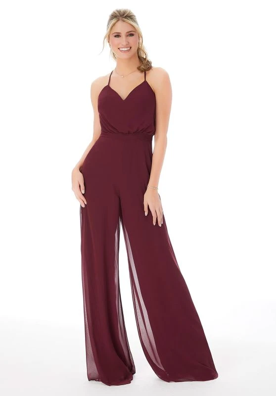 Mori Lee 21690 chiffon bridesmaid jumpsuit features a blouson top with a shallow V-neckline and spaghetti straps that crisscross at the semi-open back. A slim set-on waistband tops the wide-leg pants, finished with side pockets.