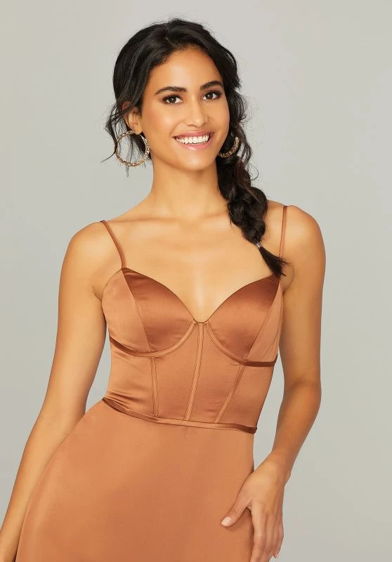Mori Lee 21751 silky satin bridesmaid dress features a corseted sweetheart bodice with adjustable spaghetti straps, low back and detachable draped straps. A thin waistband tops the crossover A-line skirt, finished with a thigh-high slit and brush train.