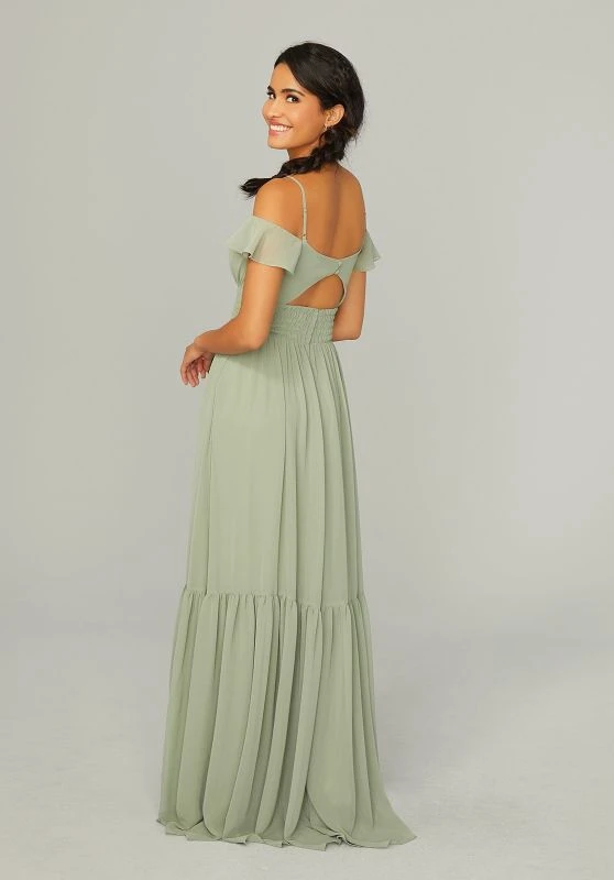 Mori Lee 21768 boho chiffon bridesmaid dress features an A-line silhouette with a sweetheart neckline, cold-shoulder ruffle sleeves and a keyhole back. The smocked waist gives way to the peasant-style skirt, ending in a sweep train.