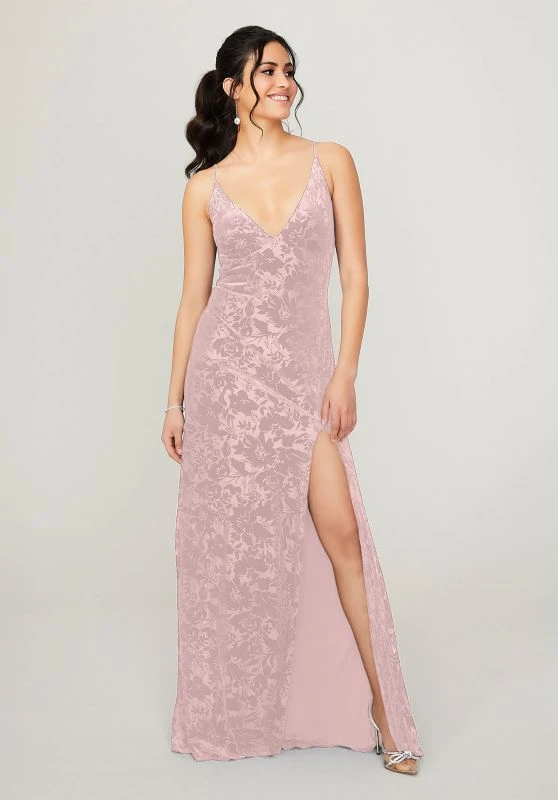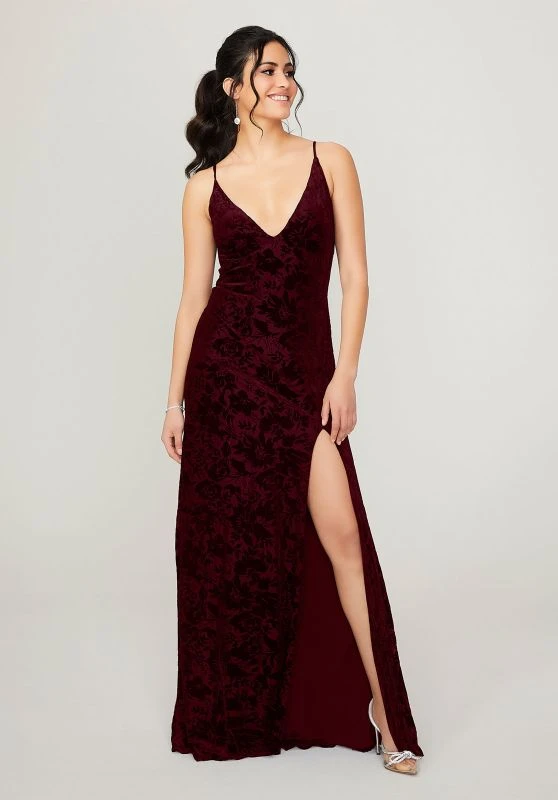 Mori Lee 21781 fit and flare long bridesmaid dress features a low V-neckline, adjustable spaghetti straps and an open cowl back with a thin band. A thigh-high slit accents this floral velvet bridesmaid dress, finished with a slight brush train.