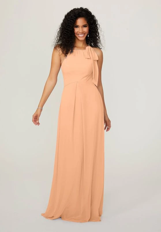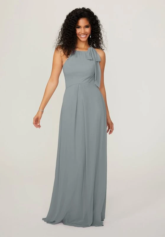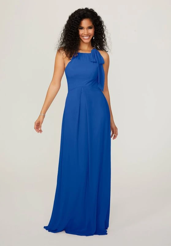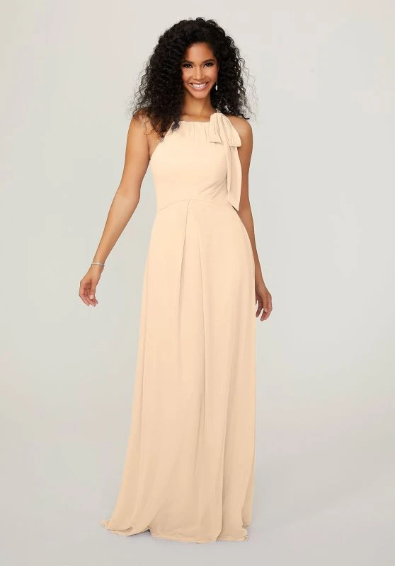 Mori Lee 21787 A-line bridesmaid dress features a slightly ruched bodice with a modified halter neckline, jazzed up with a side bow and a keyhole back. The reverse basque waist gives way to the pleated skirt and brush train.