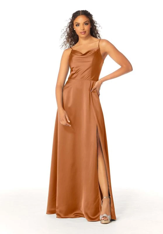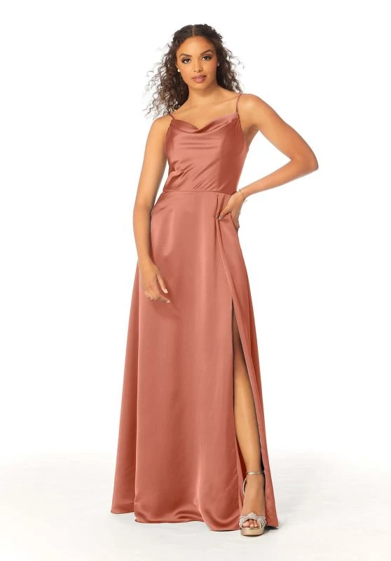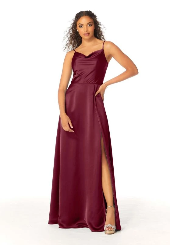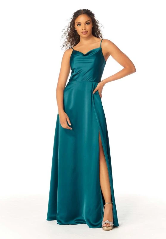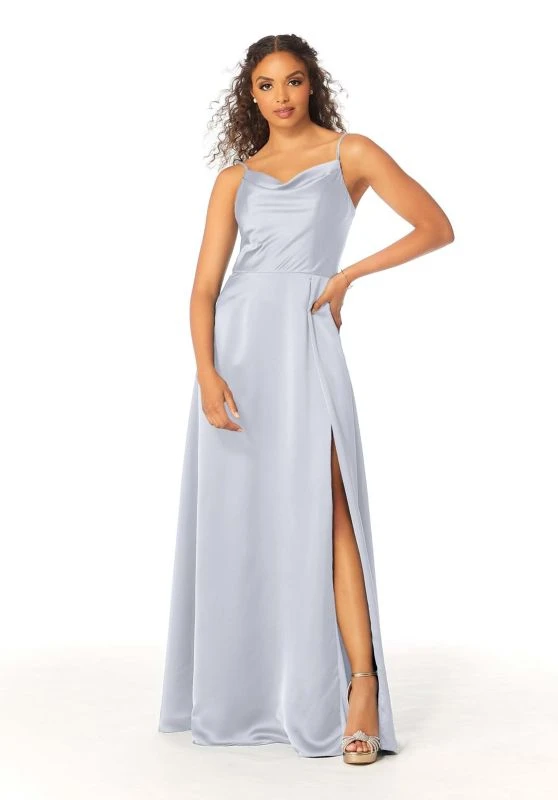 Mori Lee 21813 A-line long bridesmaid dress is fashioned in silky satin, with adjustable spaghetti straps edging the soft cowl neckline and low-rise back. The seamed waist gives way to the overlap skirt with a high front slit and sweep train.
