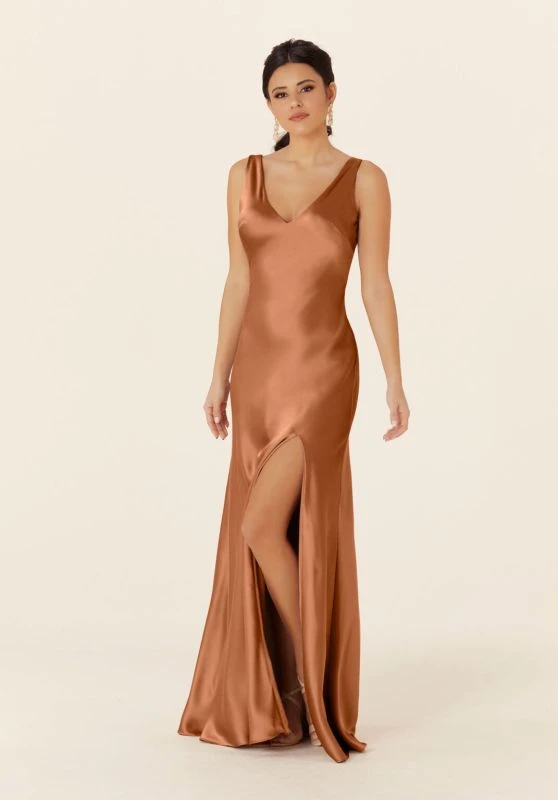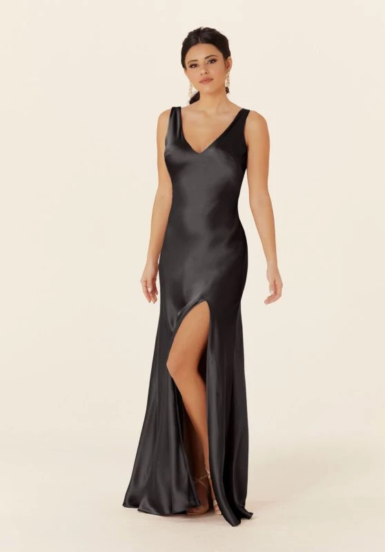 Mori Lee 21835 sleeveless bridesmaid dress features a slim silhouette in luxe satin, with a V-neckline and an open back with tied streamers. This simple formal gown is completed with a front side slit and a brush train.