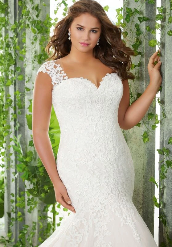This Mori Lee Julietta 3255 Phylicia sweetheart neckline wedding dress features illusion cap sleeves leading into the cutout back atop a lace-up closure. The drop waist bodice of this plus size trumpet gown is styled in Chantilly lace over tulle, embellished with frosted Alencon lace appliques. Lace appliques adorn the tulle skirt as it cascades into a scalloped lace hemline.