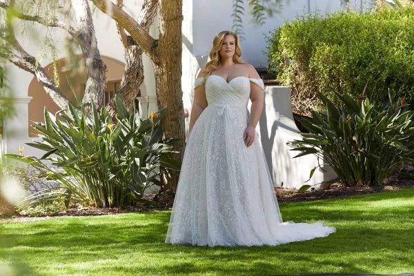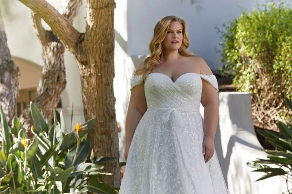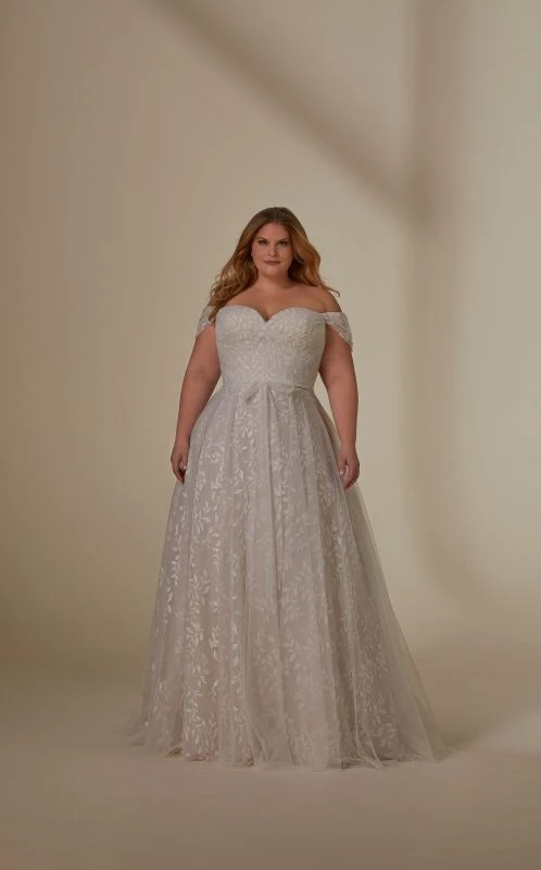 Mori Lee Julietta 3394 Laurentina plus size bridal dress features a ruched surplice bodice with a sweetheart neckline and detachable off-the-shoulder sleeves. This A-line wedding gown is fashioned in soft tulle over vine-inspired embroidery, finished with a sash belt and covered buttons from the low-rise back to the chapel train.