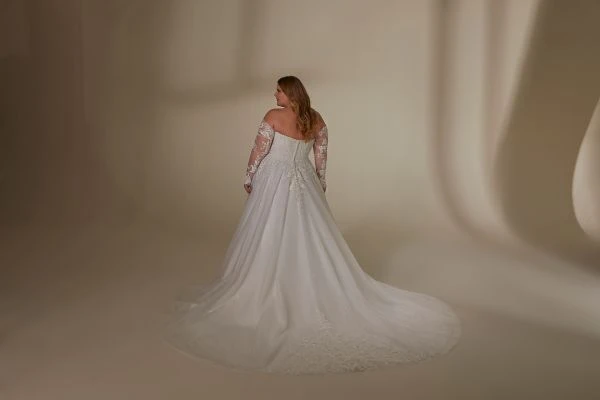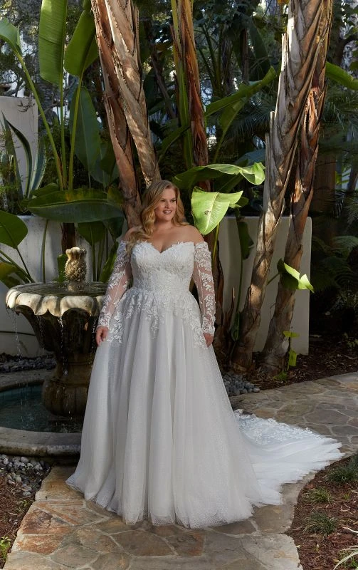 Mori Lee Julietta 3397 Leandra plus size wedding gown is fashioned in sparkle tulle, with a strapless sweetheart neckline and detachable illusion long sleeves. Beaded lace appliques embellish the bodice and the chapel train of this A-line bridal dress, finished with covered buttons on the mid-rise back. Sleeves are also sold separately as Style 11459.