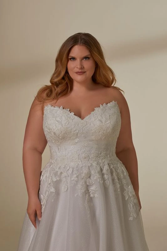 Mori Lee Julietta 3397 Leandra Lace Train Strapless Plus Size Wedding Dress