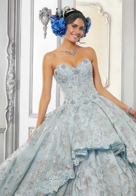 Mori Lee Valentina 34055 light blue and silver quinceanera gown is styled in patterned glitter tulle, with a strapless sweetheart neckline and lace-up back. Embroidered lace appliques coat the fitted bodice, jazzed up with rhinestones and crystals. The basque waist gives way to the pleated high-low skirt with a detachable ball skirt, finished with lace edging and a sweep train. Set includes a removable stole.
