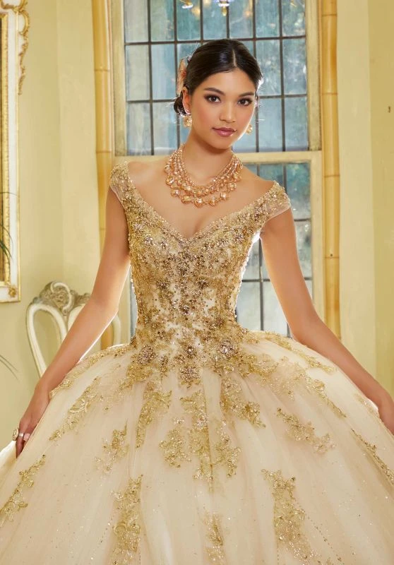 Mori Lee Valentina 34064 champagne gold sweet 16 gown is crafted in tulle over sparkle net, with an off-the-shoulder neckline and a laced-up cutout back. Metallic embroidery appliques and gorgeous beadwork embellish this glitter quince dress, finished with a basque waist and a sweep train. Set includes a matching shawl.