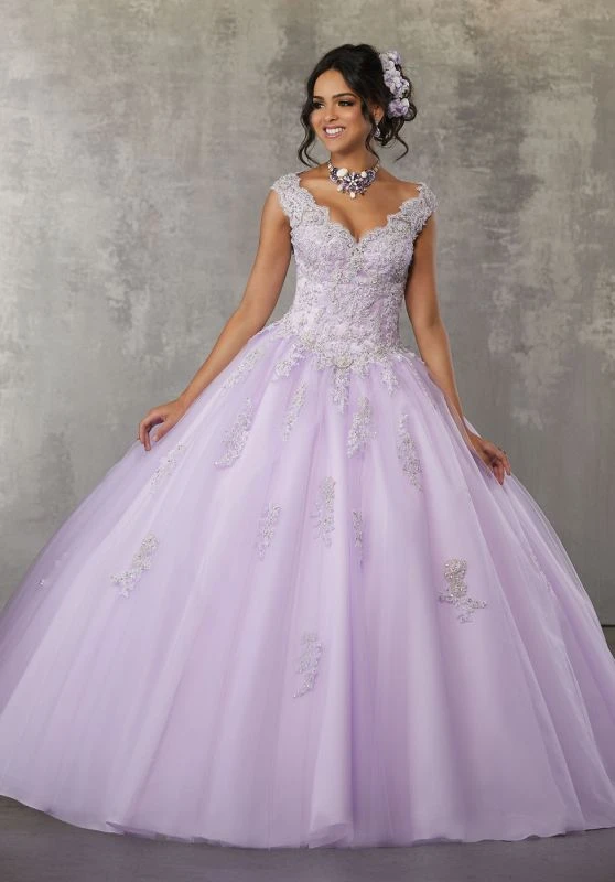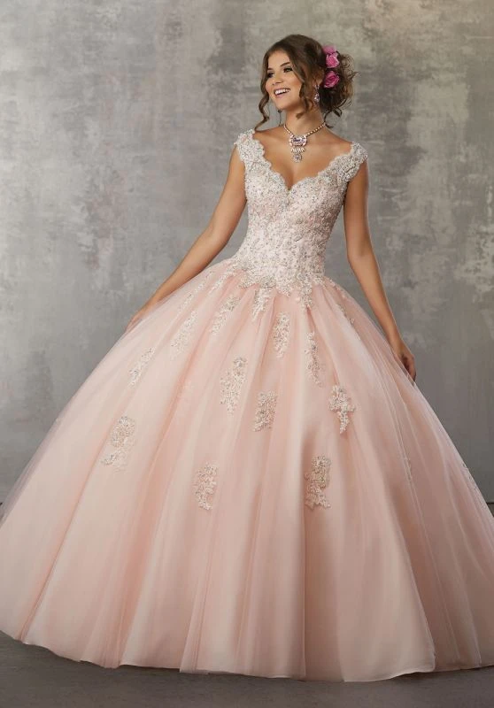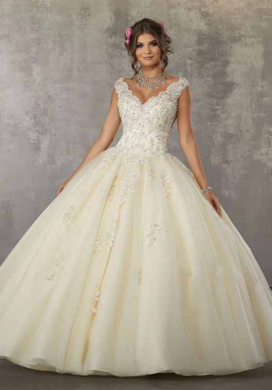This Mori Lee Valencia 60033 sweet 16 dress features a lace-appliqued bodice, with cap sleeves edging the scalloped portrait neckline and cutout back. Gathered at the basque waist, the tulle ballgown skirt billows with scattered appliques. The laced-up back offers a comfortable fit. Set includes a matching stole.