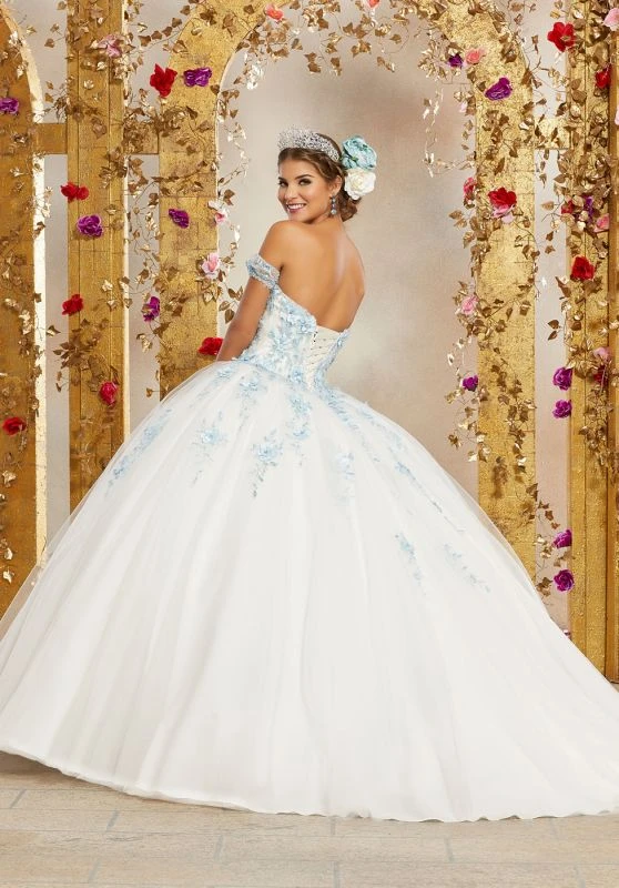 This Mori Lee Valencia 60071 tulle quince gown showcases a strapless bodice with a sweetheart neckline, lace-up back and detachable off-the-shoulder sleeves. This beautiful ball gown is adorned with three-dimensional floral appliques and embroidery. The full skirt cascades from the basque waistline and a matching stole complements this dress.