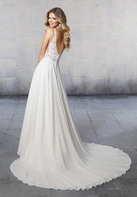 Mori Lee Voyage 6927 Shiloh A-line beach bridal dress features an embroidered net bodice with a plunging mesh insert neckline, sheer sides and low V-back. Double banded waist trim cinches the midriff, giving way to the flowing chiffon skirt and chapel train. Covered buttons conceal the back zipper. Available with front bodice lining as Style 6927L.