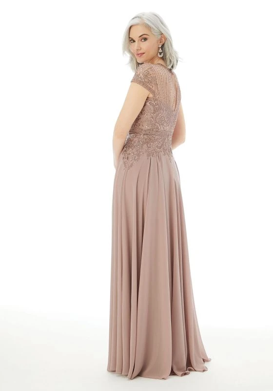 Mori Lee MGNY 72221 charcoal evening gown features a beaded embroidered bodice with an illusion jewel neckline, cap sleeves and sheer keyholes. The beaded waist gives way to the A-line chiffon skirt. Set includes a matching stole.