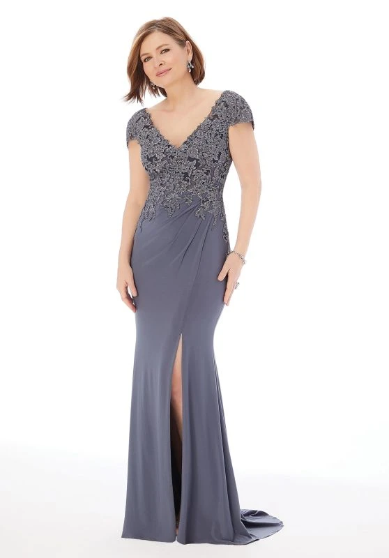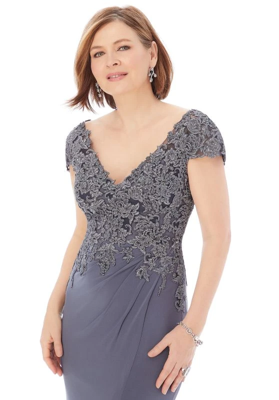Mori Lee MGNY 72226 charcoal evening gown is crafted in luxe jersey, featuring a beaded lace-appliqued bodice with a V-neckline, V-back, and cap sleeves. Side gathers on the skirt add texture to this fit and flare formal dress, finished with a side-front slit and sweep train. Set includes a matching stole.