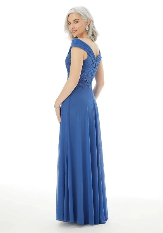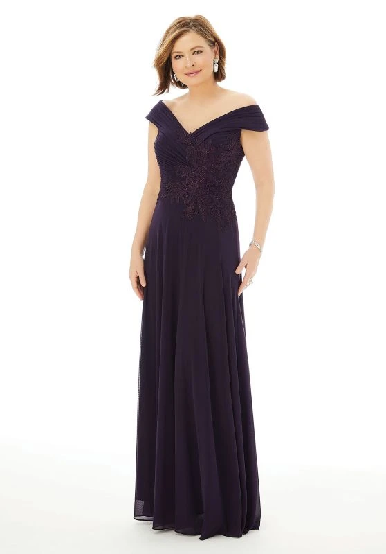 Mori Lee MGNY 72229 eggplant mother of the bride dress features a ruched bodice with beaded lace appliques and an off-the-shoulder portrait neckline. This slim A-line gown is fashioned in stretch mesh, and comes with a matching stole.