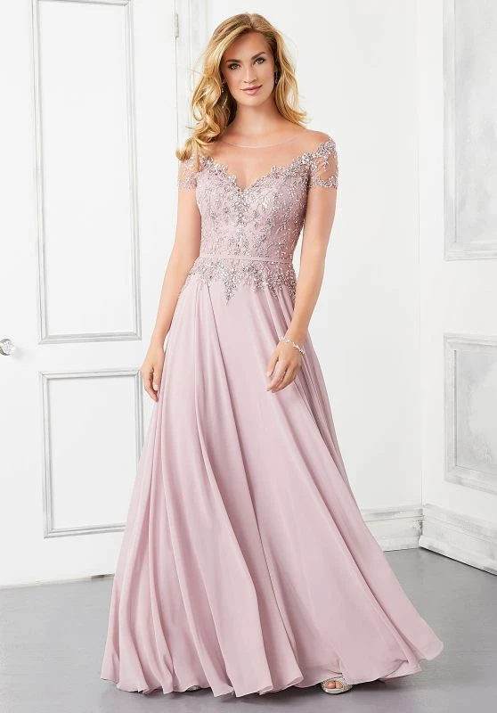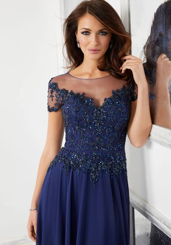 Mori Lee MGNY 72309 sapphire mother of the bride dress features a crystal-beaded lace bodice with a sheer neckline, short sleeves and sheer keyhole back. A slim waistband tops the flowing chiffon skirt, finished with side pockets and a brush train. Set includes a matching stole.