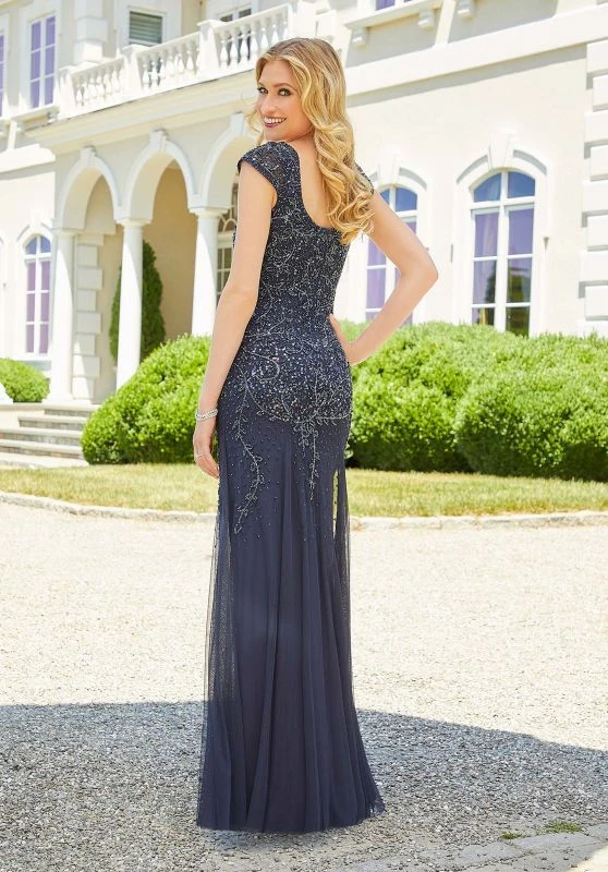 Mori Lee MGNY 72501 dusty rose evening gown features a slim-flare silhouette with cap sleeves to frame the scoop neckline and scoop back. Intricate tonal beadwork embellishes this soft net formal dress. Set includes a matching net stole.