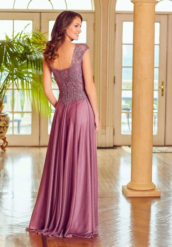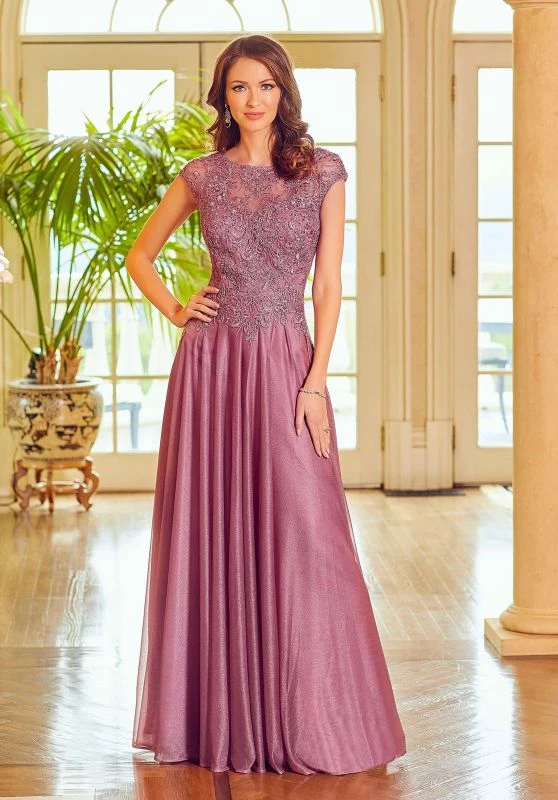 Mori Lee MGNY 72520 rose mother of the bride dress features a beaded lace overlay bodice with cap sleeves edging the bateau neckline and square back. This A-line evening gown finishes in a metallic crepe skirt and a sweep train.