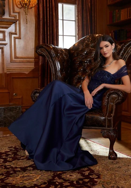 Mori Lee MGNY 72811 evening dress features an A-line silhouette in luminous satin, with a strapless straight neckline and a detachable ruched tulle wrap. Beaded embroidery and 3D floral appliques embellish this elegant formal gown, finished with princess seaming and a sweep train.
