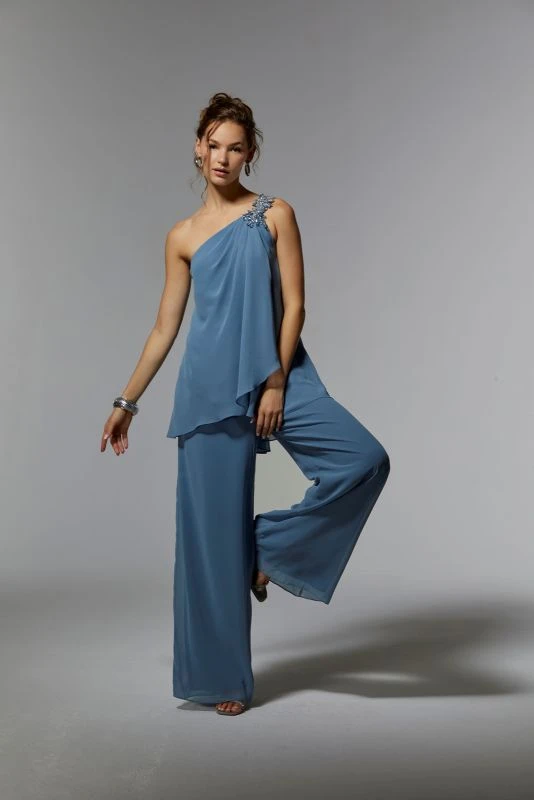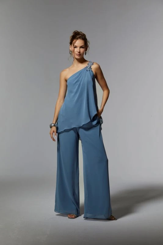 Mori Lee MGNY 72912 chiffon evening pant suit features a draped top with a one-shoulder asymmetric neckline supported by a slim strap with beaded applique. The top of this two-piece formal pant suit also highlights a flowy asymmetrical hem, and is finished with wide-leg cut pants. Set includes a matching stole.