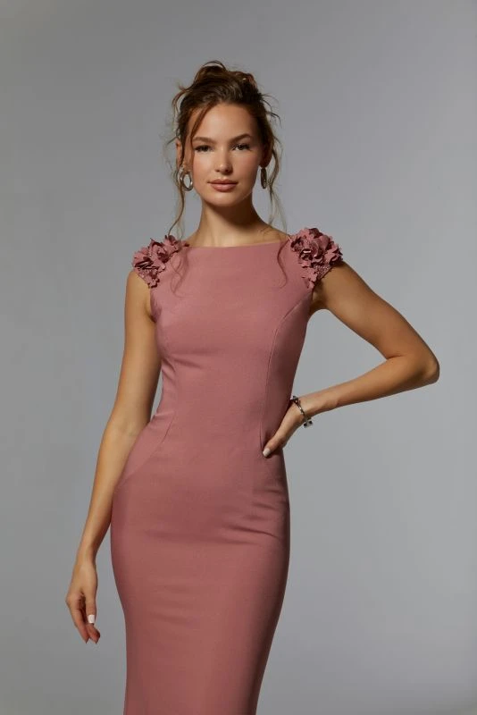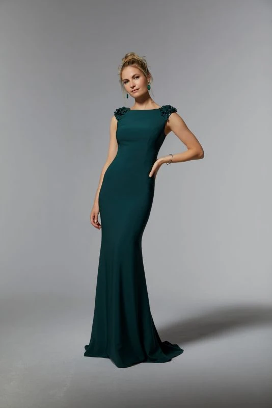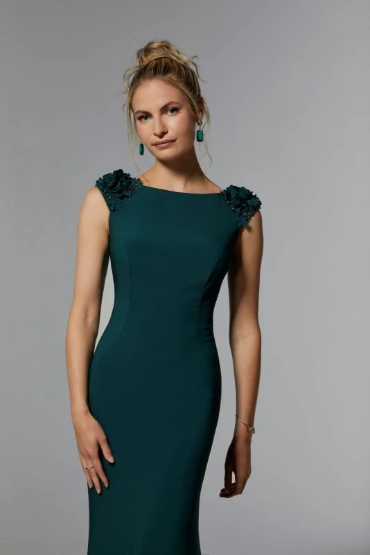 Mori Lee MGNY 72920 slim-flare mother of the bride gown in stretch crepe features a bateau neckline and cap sleeves embellished with beaded 3D floral appliques. Draped cowl back with button details accents this floor-sweeping evening dress.