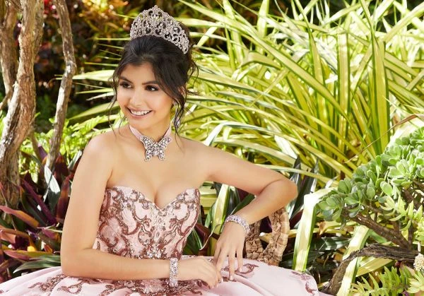 Mori Lee Vizcaya 89285 blush and rose gold quinceanera gown features an embellished sweetheart bodice with removable puff sleeves and lace-up back. The basque waist gives way to the peplum skirt, jazzed up with alternating panels of patterned sequins and beaded embroidery. This satin ballgown comes with a cap sleeve bolero.