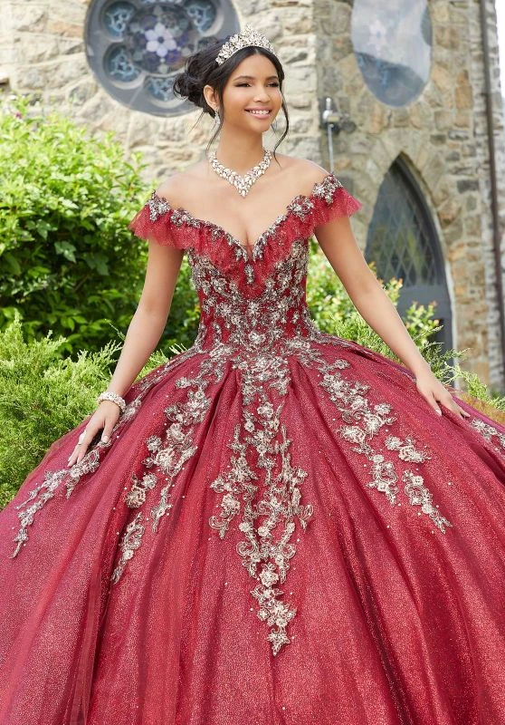 Mori Lee Vizcaya 89342 sangria gold quince gown is styled in soft net over crystallized tulle, with a ruffled off-the-shoulder neckline and a laced-up back. Metallic embroidery appliques embellish this basque waist ballgown, finished with a pleated skirt, horsehair hem, and sweep train. Set includes a matching stole.