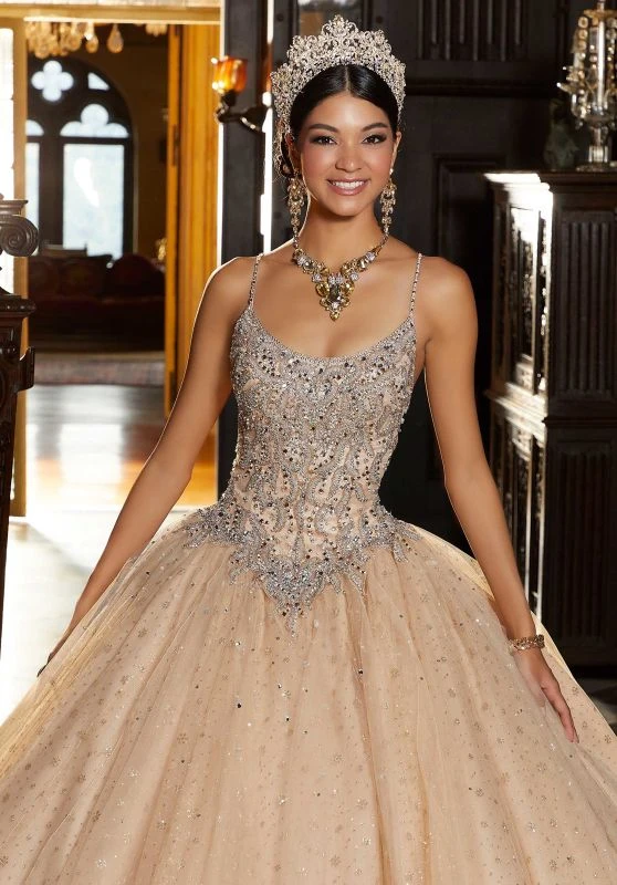 Mori Lee Vizcaya 89345 nude gold quinceanera dress features a beaded embroidered bodice with a scoop neckline, spaghetti straps and a laced-up back. The basque waist gives way to the gathered ball skirt, crafted in tulle over metallic net and finished off with a sweep train. Set includes a matching bolero.