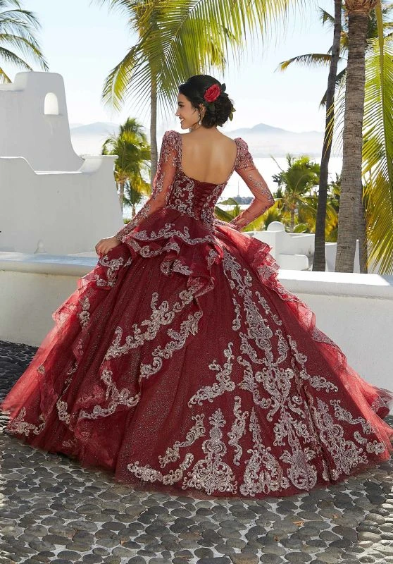 Mori Lee Vizcaya 89352 sangria gold quince gown features an embellished sweetheart bodice with removable illusion long sleeves and a laced-up back. Crystal beaded glitter embroidery stretches all over this sparkle tulle ballgown, finished with a basque waist and a flounced overskirt. Set includes a matching stole.