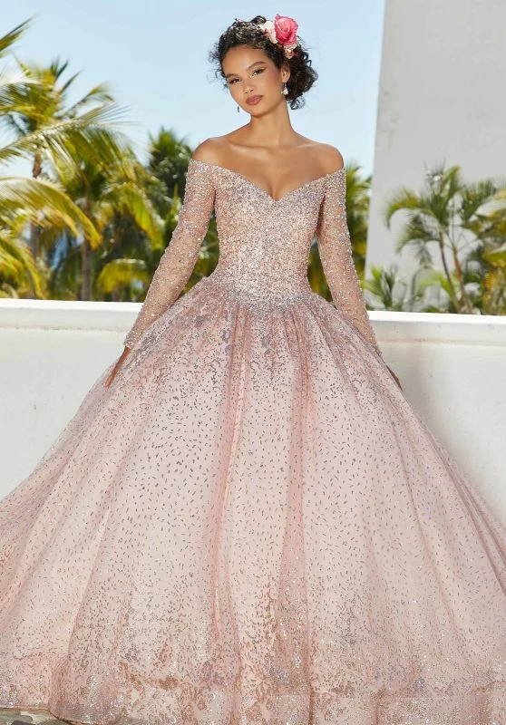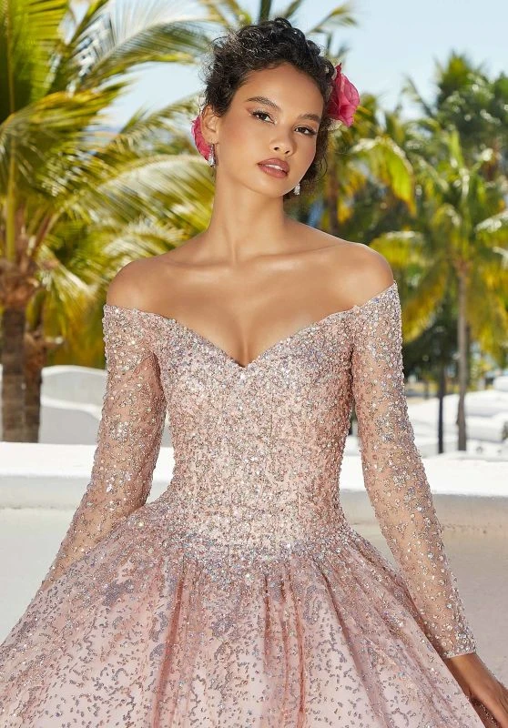 Mori Lee Vizcaya 89355 blush rosegold quinceanera gown is fashioned in cracked ice tulle, with an off-the-shoulder neckline and illusion long sleeves. Sparkling crystal beads dot this basque waist ballgown, finished with a laced-up back, horsehair hem, and sweep train. Set includes a matching stole.