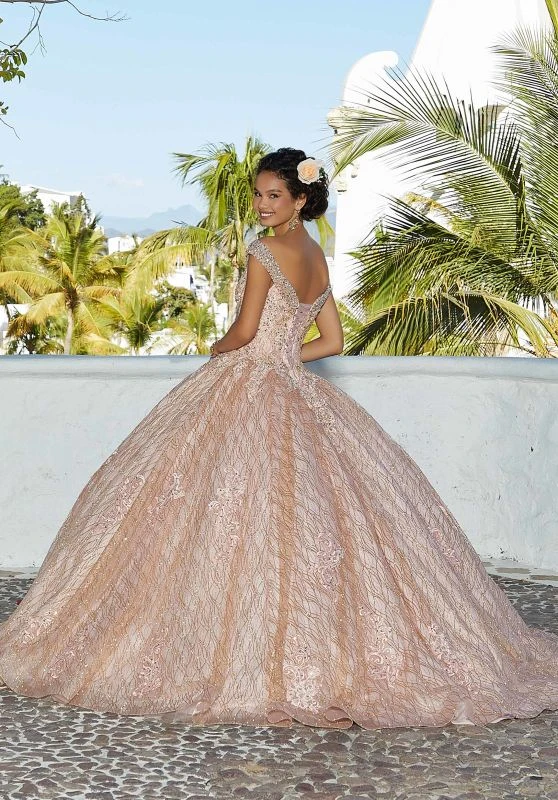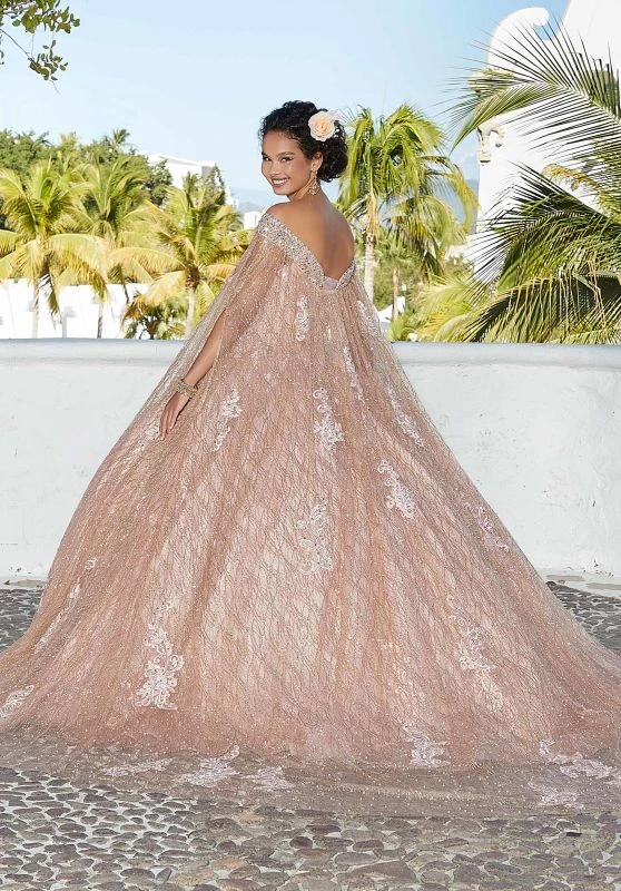 Mori Lee Vizcaya 89357 blush rosegold quince gown features a beaded embroidered bodice with a portrait neckline, a laced-up back and a removable cape. The basque waist gives way to the glitter tulle ball skirt, jazzed up with lace appliques and beadwork, and finished with a horsehair hem and sweep train. Set includes a matching stole.