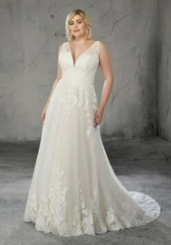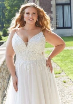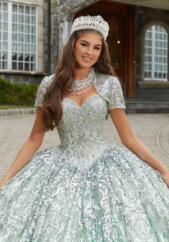 Mori Lee Vizcaya 89401 silver sage quince dress features a sweetheart corset bodice with slim straps, lace-up back and removable oversized bell sleeves. This basque waist ballgown is fashioned in ombre patterned sequins over glitter tulle, finished with a statement back bow applique and a sweep train. Set includes a short-sleeved bolero.