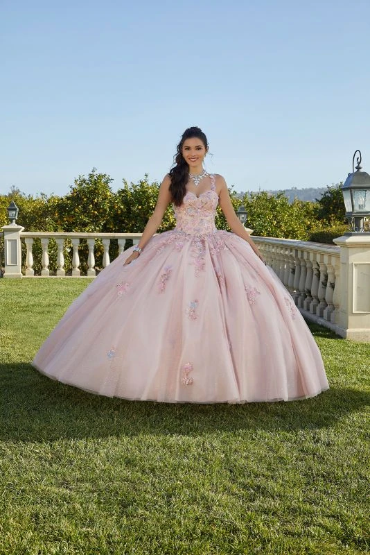 Mori Lee Vizcaya 89424 sparkle tulle quinceanera dress features a sweetheart corset bodice with floral spaghetti straps and a low laced-up back. Beaded embroidery and 3D floral appliques luxuriously embellish this basque waist ballgown, finished with a sweep train. Set includes a matching stole.