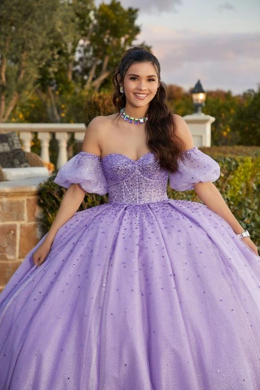Mori Lee Vizcaya 89426 sparkle tulle quince dress features a corset bodice with a strapless sweetheart neckline, a low lace-up back and detachable puff sleeves. Fadeout rhinestone beadwork embellished this sweet 16 ballgown, finished with a pleated skirt and a sweep train. Set includes a matching stole.