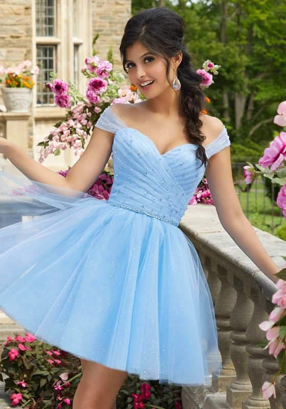 Mori Lee Damas de Vizcaya 9535 french blue short quince dress features a pleated bodice with an off-the-shoulder sweetheart neckline and crystal beads. The beaded waist gives way to the fully gathered skirt. This glitter tulle party dress finishes in a laced-up back.
