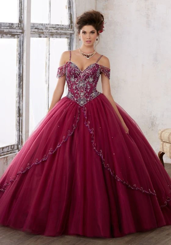 Off-the-shoulder illusion sleeves frame the beaded bodice with a V-neckline and beaded spaghetti straps of this Mori Lee 89135 tulle quinceanera dress. This dress features a basque waist and a lace-up back. Scattered sequins accent the bead trimmed asymmetrically slit overlay on the ball gown skirt. A matching stole complements this gown.