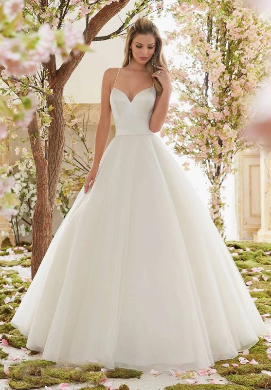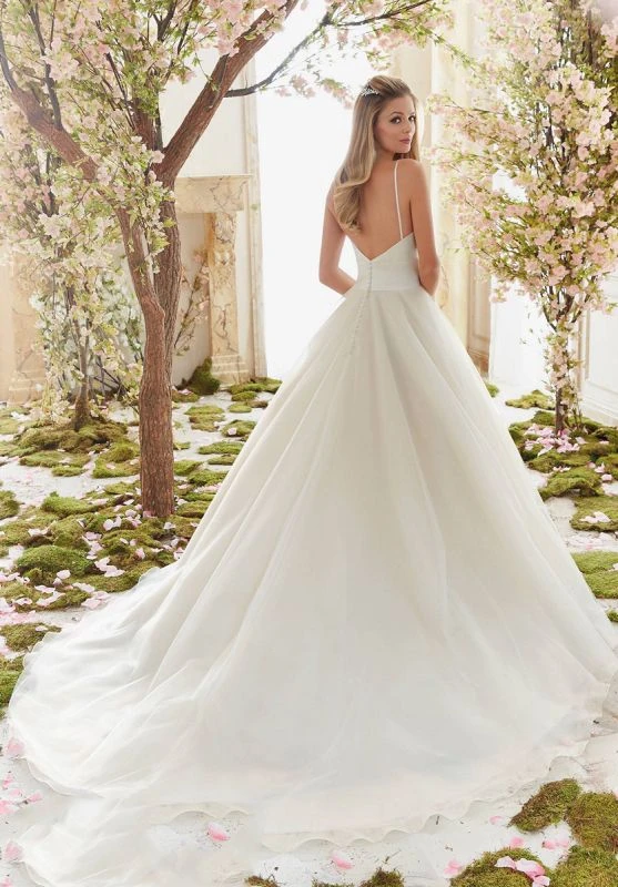 The sleeveless bodice of this Mori Lee Voyage 6831 wedding dress is styled in Duchess satin and has a sweetheart neckline and an inset waistband. Spaghetti straps lead into the semi-open back with covered button closures and the ball gown skirt with chapel train cascades in layers of tulle.